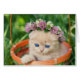Un chaton adorable avec une couronne de fleurs est assis dans un panier coloré dans cette carte blanche. Ajoutez votre propre salutation ou utilisez vierge comme papier à lettres.
