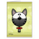 Le visage mignon d'un chat de tabby gris caricaturé est vu avec un collier rouge et un arrière - plan jaune avec une bordure jaune plus foncé. Design original par Christie Black de Creations from the Heart.