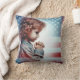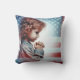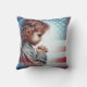 Een jong kind met krullend haar wordt gezien biddend met vastgeklemde handen, geplaatst tegen een achtergrond van een Amerikaanse vlag