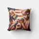 Een jong meisje en een golden retriever staan naast elkaar, beide met hun ogen dicht en handen / poten samen in een gebedsachtig gebaar op de achtergrond van een Amerikaanse vlag