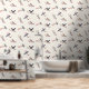 Een behang met een patroon van kleine vogels op bloesem boomtakken. Er zijn vijf verschillende vogels op een witte achtergrond