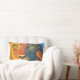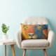 Een lumbale kussen met een digitaal afbeelding van olieverferen, dicht bij een leeuwige kant, met een luiende mane en doorboeiende gele ogen. De dominante kleuren omvatten oranje en geel.