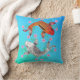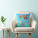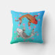 Een kleurrijk Aziatisch geïnspireerd accent gooit kussen, met een grafisch kunstwerk van twee gelukkige karpers die rond roze bloemen zwemmen, op een blauwe en aqua achtergrond.