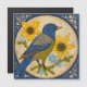 Kleurrijke illustratie van een vogel op een tak, omringd door gele bloemen en blauwe madeliefjes. Het kunstwerk heeft een gestippeld patroon en een harmonieuze mix van blauwe, gele en aardse tinten, waardoor een vrolijke en levendige compositie ontstaat.