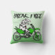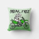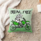Een cartoon, illustratie van een zwart-witte koe die ontsnapt uit een boerderij op een groene motorfiets.