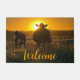 Deze warme en uitnodigende Welcome deurmat heeft een afbeelding van een koe en twee kalveren staan achter een prikkeldraad hek op de prairies van Alberta met de ondergaande zon gloeien achter de koe silhouetten. Het woord "Welcome" is onderaan gedrukt in een goudgele kleur.