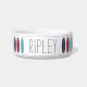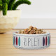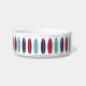 Voor huisdieren die tien hangen, heeft deze coole, gepersonaliseerde kom op het strand een patroon van rode, marinesolf blauwe en blauwgroen surfplanken met retro-stijl op een witte achtergrond voorzien van jaloerijse strepen. Pas de naam van uw hond of kat aan met de naam in blauw handgeschreven stijl.