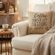 Introductie van de "Coffee First Ask Questions Later Sierkussen", een must-have voor elke koffieliefhebber. Dit charmante accessoire heeft een rustieke jute achtergrond met de woorden "Coffee First Ask Questions Later" kunstig gerangschikt in elegante wanorde, het creëren van een heerlijk visueel spel dat de energieke spontaniteit van uw favoriete barista weerspiegelt. De rijke bruine tinten van de tekst gaan harmonieus samen met de jute, wat de geruststellende essentie van een vers gebrouwen koffiekopje oproept. Perfect voor het toevoegen van een gezellige touch aan elke woonruimte, dit chique gooi kussen dient als een stijlvolle herinnering dat de beste gesprekken beginnen met een slokje koffie.