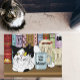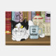 Zwart-witte smoking cat wordt net wakker op een keuken aanrecht met zijn kat koken boeken, koffie mok, suiker en creamer.