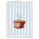 Illustratie van een verzachtende, zwamende kop koffie tegen een blauwe en witte gestreepte achtergrond. Ideaal om te gebruiken als een uitnodiging om te brunchen, koffie of gewoon om samen te komen met cafeïneliefhebbende vrienden! Komt ook overeen met: