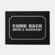 Een zwarte deurmat gezegde "Kom terug met een bevel" in hoofdletters. Een grappige deurmat voor mensen met een speciaal soort humor en een liefde voor de politie.