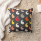 Een modern, minimalistisch paisleypatroon gooit kussen in tinten van rood, mosterdgoud, aqua, grijs en wit, met contrasterende gekleurde contouren, op een donkere koolgrijs/grijze achtergrond