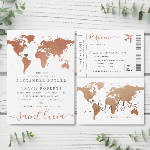 Boarding Pass Save the Date Cards hebben een elegant, modern kaartontwerp met een faux koperen folie reisthema. Alle tekst- en achtergrondkleuren zijn bewerkbaar, zodat u uw eigen ontwerp kunt creëer met deze sjabloon voor een vliegtuigticket dat is ontworpen met een bestemmingsbruiloft of reisthema bruiloft of geloftevernieuwing in gedachten. Ga naar het Custom Paper Works designer collectie voor overeenkomende objecten.