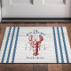 Kustkreeft Seaside Beach House deurmat heeft een witte achtergrond met een rode waterverf stijl Maine kreeft en marineblauwe touw strepen. Personaliseer het met uw familienaam en de datum die is vastgesteld in een klassiek marineblauw lettertype. Perfect voor zomerstrandhuizen en huisjes aan het water.