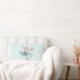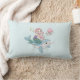 Een lumbaal kussen met een schattige illustratie. Ontworpen met een zeemeermin meisje rijden op een gelukkige dolfijn. Een kleine kwal vriend vergezelt hen. Versierd met kleine splatters van faux gouden glitter. Lichtblauwe achtergrond met vervaagde roze stippen.