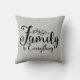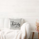 Coussin avec une citation en noir cursive écrit "La famille c'est tout" sur un arrière - plan gris plus que texturé. Conception par Farmhouse Living. Des options de taille et de tissu sont disponibles et des produits de décoration maison supplémentaires avec ce design.