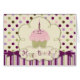 Copie douce de point de polka avec l'étiquette assortie de rayure et d'arc et d'anniversaire du regard 3D et un petit gâteau doux avec la bougie.