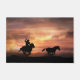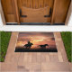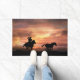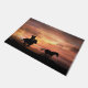 Een land westerne deurmat van een cowboy die een wild paard met een zuidwestelijke zonsondergang beroert.