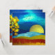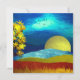 Een prachtig abstract landschapsontwerp met een unieke lucht die lijkt op rimpelingen in vloeistof en een maan, bergen en een goudboom.