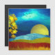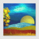 Een prachtig abstract landschapsontwerp met een unieke lucht die lijkt op rimpelingen in vloeistof en een maan, bergen en een goudboom.