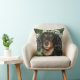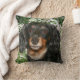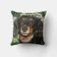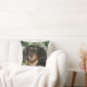 Zwarte, langharige dachshund met een achtergrond van een wildbloem, met een kussen op de achtergrond