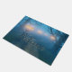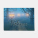 Vier gloeiende lampen op vier lantaarnpalen schijnen door dichte mist en verlichten een kronkelend pad door de schaduwen en kale takken van winterbomen.