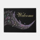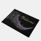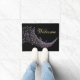 Lavender Muzieknoten Design Black Welcome Mat. Een lichte paarse staf van muzieksymbolen, zwanen en muzikale noten en welkom geschreven in goud. Ideaal voor buiten je studio of thuis en een geweldig cadeau voor je favoriete muzikant of muziekliefhebber.