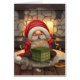 Petit Père Noël enveloppant un cadeau devant la cheminée