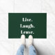 Tot slot, een inspirerend gezegde voor de introverte onder ons. "Leef. Lach. Vertrek." verkondigt deze humoristische deurmat, voor introverte, asociale en sociaal onhandige mensen die gasten ontvangen met een beetje tegenzin en misschien zelfs wel enige angst. Eenvoudige, moderne witte typografie op een klassieke bos groene achtergrond. Onverwacht, eigenzinnig en een beetje sarcastisch, deze grappige deurmat is perfect voor diegenen die donkere, droge humor waarderen en niet bang zijn om het te delen met hun bezoekers (die ze hopelijk snel zullen verlaten).