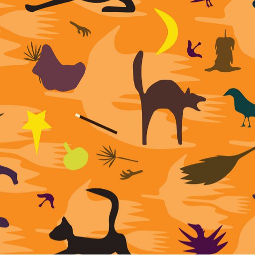 Un motif amusant, coloré, sur le thème de la sorcière sur l'orange d'halloween brillante, avec une sorcière, un balai, une lune, une chauve-souris étrange, et bien sûr plus d'un chat kitty. Il s'agit d'un motif fixe, mais vous pouvez changer la taille et la position du motif.