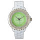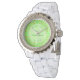Dit geweldige horloge is ontworpen voor de bruid. Het ontwerp bevat een patroon van bleke roze appelbloemen. Ze zijn twee verschillende tinten roze en hebben allemaal een geel midden. Ze zijn ideaal voor een lentetransport en zijn gemengd met appels. Elke appel is groen met een rode brij aan één zijde en een kleine bruine steel. Er is een bleke groene cirkel met witte gemarmerde patronen op het die klantgerichte teksten bevat zodat kunt u alle belangrijke details omvatten.