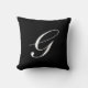 coussin monogramme personnalisé avec une lettre de script G classique sur un arrière - plan noir. Fabriqué aux États-Unis à partir de coton ou de polyester lavables à la machine. Parfait pour Gladys, Graciela, Gretchen, Georgia, Giselle, Genevieve, Gianna, Gloria, Genesis, Gina, Gabriela, Gabriella, Gabrielle, Grace ou toute autre personne qui s'appelle commence par la lettre G.