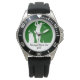 Leuke mannen polshorloge met een golfthema ontworpen met een afbeelding van een golfer die met een golfclub zwaait in een minimalistisch stijlvol ontwerp op een mannelijk horloge-ontwerp.