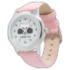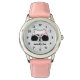 Leuk wasbeerhorloge gepersonaliseerd met de naam van kind of monogram letter. Leuk bos dier mascotte tijdwaarnemer klok ontwerp voor kleine kinderen. Beste kerst- en verjaardagsfeestcadeau-ideeën voor kinderen. Maak er een voor dochter, kleindochter, zoon, kleinzoon, nieuwe baby, kleinkind etc. Grappige cartoon illustratie voor kinderen. Girly roze of andere kleur leren band.