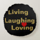 Inspirerend "Living, Laughing and Loving" zwart en gouden gooi kussen. De zwarte achtergrondkleur kan door de klant worden veranderd. Het rode hart bevindt zich voor het gouden hart. U kunt kiezen welke u in het ontwerp wilt houden. Door https://www.zazzle.com/store/celestesheffey