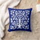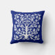 Kussen in een gestileerde, abstracte, levensboom design in wit op een diepe kobaltblauwe achtergrond