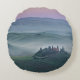 Carreau rond avec un lever de soleil brumeux avec un ciel et une brume roses entre les collines toscanes au-dessus de la ferme de belvédère de l'IL de podere d'agriturismo dans le Valdorcia (vallée d'Orcia) entre Pienza et San Quirico en Toscane, Italie.