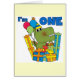 Little Dino 1st Birthday T-shirts, bodysuits, kaarten, stickers, verjaardagsknopen, canvas tassen, keepsakes, en andere dinosaurus 1st birthday kleding en geschenken met een groene lachende dinosaurus met ballonnen, feestje pet, en een cadeau!