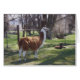Een bruine en witte lama staat in de weide en kijkt over haar jongere die slaapt. De foto's worden getransformeerd door middel van digitale manipulatie om een meer geschilderde artistieke kijk te geven.