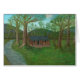 Het schilderen van het deeg van een logboekhut naast een stroom. De cabine is omgeven door bomen met bergen op de achtergrond.