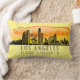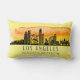 De dunne kussens zijn uitgerust met de skyline-silhouette van Los Angeles California met zonnevolle waterverf en breedte- en lengtecoördinaten op bleke gele achtergrond.
