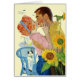 Artiest:Bernard D'Andrea | Roodharige dame kust man achter zonnebloemen met een blauwe stoel en een kat.