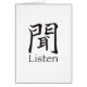 Het Japanse Kanji symbool voor het woord "Luister" wordt getoond in de lijnen van de calligrafie borstel en kijkt zeer cool op een shirt, een zak, een pet, of een knoop. We hebben de Engelse vertaling hieronder zelfs toegevoegd zodat mensen de boodschap krijgen. Het ontwerp voor het karakter is gebaseerd op een gateway met een oor binnen. cool! U kunt de achtergrondkleur wijzigen en ook tekst toevoegen.