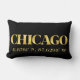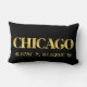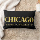 Het ontwerp van het lumbale accentkussen van Lux toont de coördinaten van de breedte- en lengtekaart van de stad Chicago in gouden lettertypen op een zwarte achtergrond