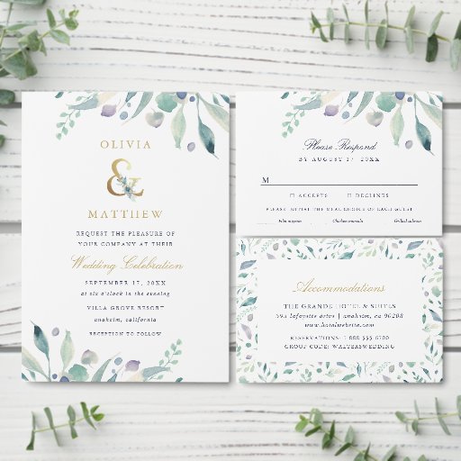 Betaalbare op maat gemaakte doucheuitnodigingen van huwelijkspartners die zijn afgestemd op je evenementgegevens. Dit elegante ontwerp is voorzien van een bruine bruine bruine bruine folie met een fijne blauwe en groene waterverf op een witte achtergrond. Gebruik de ontwerphulpmiddelen om de tekst aan te passen, de doopvonten en de kleuren uit te geven of uw eigen foto's toe te voegen aan creëer een klastige en stijlvolle uitnodiging voor de trouwdouche.