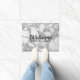 Luxueuze witte marmer print welkome gebarsten deur mat. Maak uw eigen gepersonaliseerde binnen- of buitenslaapstand met aangepaste achtergrond. Voeg uw eigen welkomstbericht, bedrijfsnaam, familienaam, initiaal letters of grappige quote toe. Luxe cadeauidee voor nieuw thuis, kantoor, verhuizing, winkel, sportwinkel, bedrijf, bedrijf, club, bruiloft, feestplaats, enz. sjabloon met scripttypografie. Creëer uw eigen fancy binnenmat, tapijt voor de voordeur, de ingang of de hal. decor en decoraties voor je huis. Zwart-wit patroonontwerp met zwarte tekst.