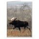Carte Bull Moose verticale. Un gros morceau d'orignal à travers la brosse à gomme dans une zone de collines de sable du sud de l'Alberta, Canada. L'orignal semble déplacé dans ce terrain sec et sablonneux qui a très peu d'eau pour soutenir la végétation aquatique sur laquelle l'orignal se nourrit habituellement.