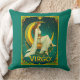 Kussen in een vrouw in vloeiende witte gewaden, met een bloem in haar haar, sierlijk zittend op een gouden halve maan, omringd door sterren. Art Nouveau-omlijsting met bloemen en het woord "VIRGO" completeren de hemelse dierenriemillustratie.