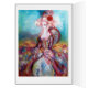Elégant, coloré, classe et unique design dans les couleurs vives, rouge, rose, bleu blanc.Beau caractère femme blonde sophistiqué, tissus étincelants d'un costume baroque avec une rose rouge. Aquarelle originale et peinture acrylique avec feuille d'or et couleurs irisées sur toile