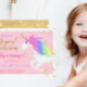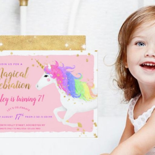 Eenhoorn verjaardagsuitnodigingen met gouden glittersterren en magische regenboogkleuren! Tekst in goud en roze, met een witte en gouden eenhoorn en regenboog tegen een zacht roze achtergrond.